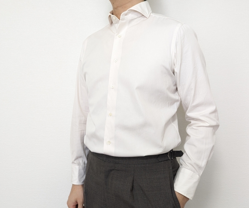 私もスプレッドカラーのシャツは色々と試してきましたが、特に個人的におすすめなのは鎌倉シャツのFRANCESE(フランチェーぜ)という襟型です。先程の参考画像でも着用していましたが、襟の感じが分かりやすいようにジャケットを脱いでみました。